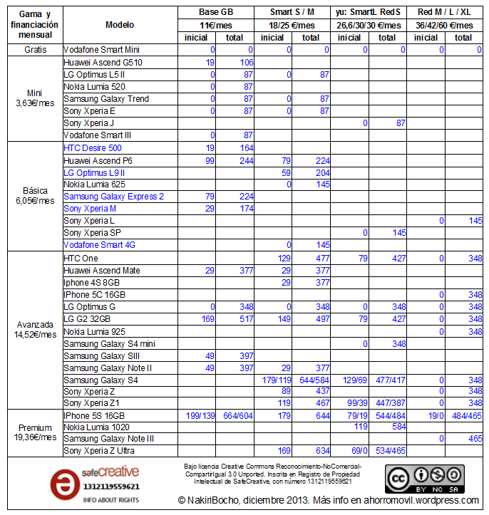 Resumen de precios de moviles en retenciones de Vodafone con tarifas red, smart, yu: y base para diciembre 2013
