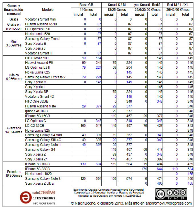 Resumen de precios de moviles en retenciones de Vodafone con tarifas red, smart, yu: y base para diciembre 2013 revisión