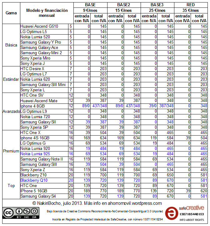 Resumen de precios de moviles en retenciones de Vodafone con tarifas red y base para julio 2013