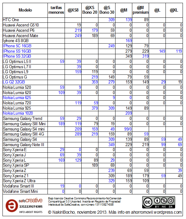 Resumen de precios de moviles en retenciones de Vodafone con tarifas por tallas para noviembre 2013