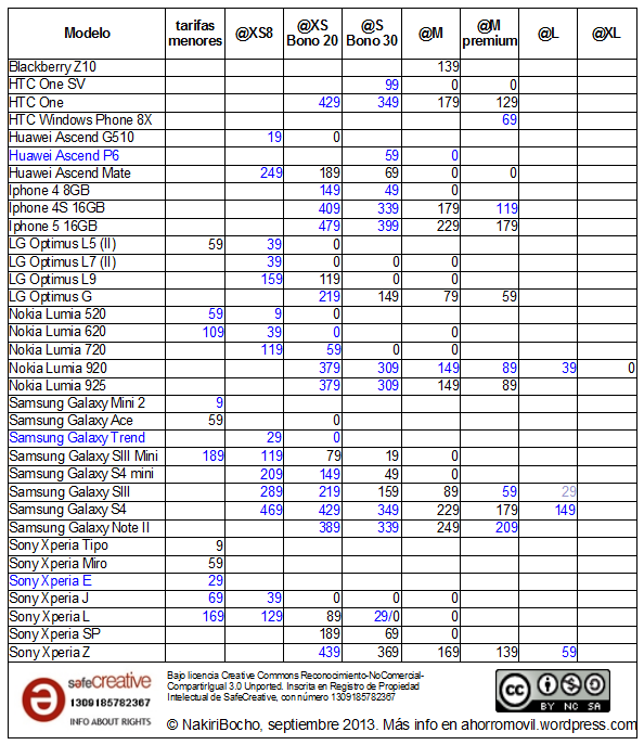 Resumen de precios de moviles en retenciones de Vodafone con tarifas por tallas para septiembre 2013 v2