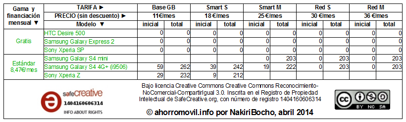 Resumen de precios de moviles en oferta especial de retenciones de Vodafone con tarifas red, smart, yu: y base para abril 2014