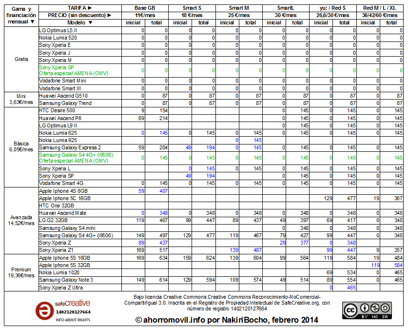Resumen de precios de moviles en retenciones de Vodafone con tarifas red, smart, yu: y base para febrero 2014 revisión